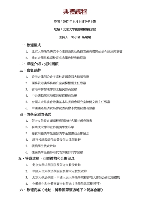 在普通法课程和模拟法庭的基础上,6日晚上第七届普通法课程奖学金暨丽达奖学金颁奖典礼在凯原楼模拟法庭隆重举行。出席典礼的嘉宾有香港大律师公会主席林定国资深大律师、香港大律师公会大中华事务常委会主席麦业成大律师率领的香港大律师团队,国务院港澳事务办公室副主任黄柳权、香港中联办法律部部长王振民、中央统战部三局巡视员覃菊华、全国人大基本法委研究室副主任陈建文、中国国际经济贸易仲裁委员会副秘书长李虎、美国德杰律师事务所陶景洲、国务院港澳办法律司副处长肖明、中央统战部三局李耿巍副处长等中央有关部门领导及业界嘉宾,beat365亚洲版官网常务副校长吴志攀教授、beat365亚洲版官网院长张守文、中国人民大学beat365亚洲版官网院长韩大元教授、beat365亚洲版官网党委书记潘剑锋教授、中国人民大学beat365亚洲版官网副院长时延安教授、beat365亚洲版官网副院长郭雳教授、beat365亚洲版官网强世功教授、高薇教授等,以及2017年《普通法精要·公法》、《国际商事争端解决:实务与训练》课程全体同学、2011-2016年普通法课程奖学金和丽达奖学金获奖者代表。