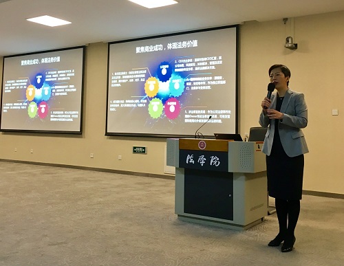 首先,华为法律部部长郑丽英女士对华为法务部进行整体介绍,她希望通过这次宣讲会让更多的同学了解华为,了解华为法务部,同时,也是给毕业季求职的同学们多一个选择。此次华为宣讲会的主旨是“聚焦商业成功,体现法务价值”,她自信华为有信心给大家提供一个国际化的高平台。