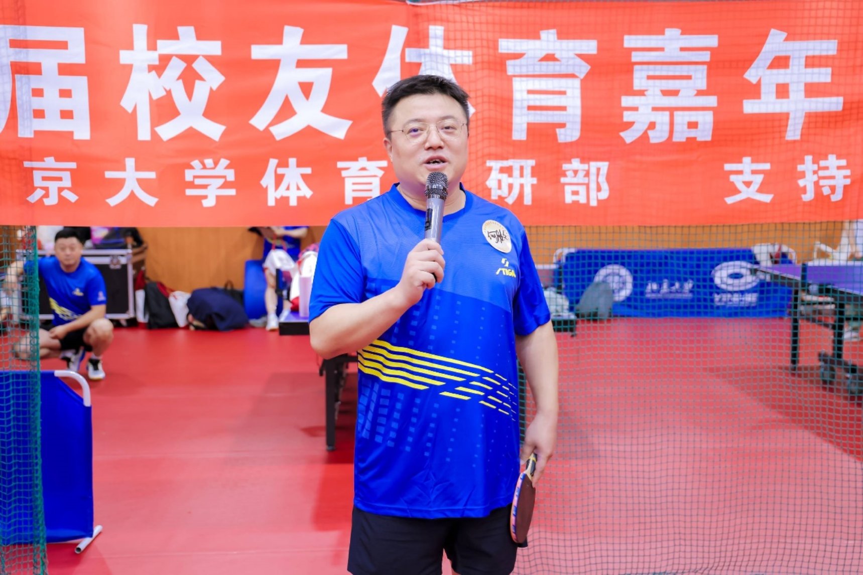 校友赞助单位代表、beat365亚洲版官网校友、北京蓝石律师事务所主任何胜文发言。他对本次校友乒乓球联谊赛的举办表示祝贺,对到场嘉宾、裁判团队及工作人员表达感谢,并预祝本次比赛取得圆满成功。