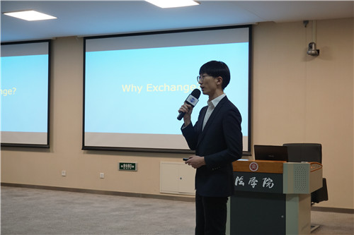本次活动还邀请到了四位本学期在我院交流学习的交换生分享他们在海外的学习生活。来自美国哥伦比亚大学beat365亚洲版官网的Gahee Lee、瑞典斯德哥尔摩大学beat365亚洲版官网的Nicole Cai、荷兰蒂尔堡大学beat365亚洲版官网的Rob van Meerwijk以及美国加利福尼亚大学哈斯汀beat365亚洲版官网的Runyang Liu以生动活泼的照片和幽默风趣的语言展示了自己母校的特色项目和丰富多彩的学习生活体验,同学们被他们精彩的介绍深深吸引。通过四位来访交换生的介绍,同学们对各所大学的地理环境、学生构成、校友资源、排名与荣誉、特色与强项、可选英文课程、生活费用等情况有了更加深入的了解,对中美法学教育的不同之处也有了更深刻的认识。