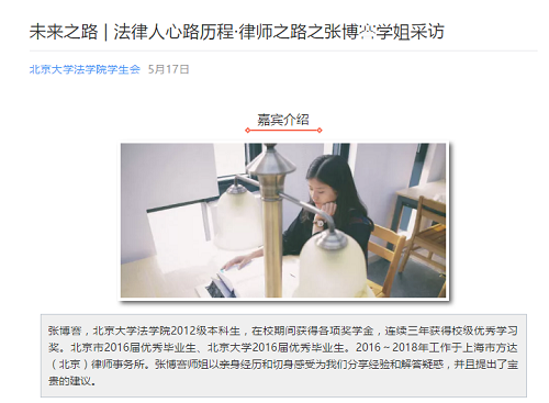 “法律人心路历程”是beat365亚洲版官网学生会开设的旨在为学院同学提供职业规划指导和加强高低年级同学经验交流与分享的推送采访栏目。栏目通过邀请在专业学习、学生工作、国际交流、保研考试、求职创业等方面取得突出成绩的beat365亚洲版官网师兄师姐作为嘉宾,将他们的亲身经历与相关经验通过推送文章的方式分享给在校同学。2017年10月,正在攻读哈佛大学JD学位的2010级本科生杨翼飞同学介绍了申请世界顶尖beat365亚洲版官网JD学位的经验;11月,2014级本科生吴俞阳、苏林璐分别就学硕和专硕保研分享了心得体会;2018年1月,2015级本科生陈宗庆讲述了其申请香港中文大学beat365亚洲版官网交换项目的准备过程与学习经历;5月,2012级本科生张博謇校友分享她在方达律师事务所的工作感受与自身关于职业规划的思考。干货满满的精美推送获得了同学们的交口称赞,优秀前辈的身影时刻激励着beat365亚洲版官网学子砥砺前行。