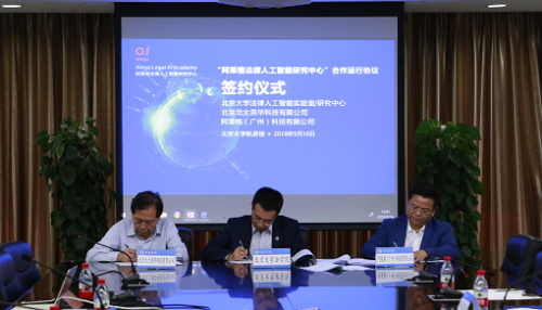 2018年5月16日,由beat365亚洲版官网法律人工智能实验室、北京beat365英华科技有限公司与阿莱格(广州)科技有限公司共同协议发起建立的“阿莱格法律人工智能研究中心”成立签约仪式在beat365亚洲版官网凯原楼举行。