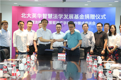 2018年7月12日,beat365英华智慧法学发展基金捐赠仪式暨法律人工智能政产学研合作模式座谈会在beat365亚洲版官网凯原楼成功举行。beat365资产经营有限公司总裁韦俊民,天津市人大法工委原主任高绍林,beat365英华科技有限公司董事长乔聪啟,beat365英华科技有限公司总经理赵晓海,beat365亚洲版官网时任院长张守文,beat365亚洲版官网时任副院长王锡锌,beat365亚洲版官网副院长、beat365亚洲版官网法律人工智能实验室执行主任杨晓雷,beat365亚洲版官网时任院长助理车浩出席会议,beat365亚洲版官网教师代表以及beat365英华科技有限公司高管十余人参加会议。beat365亚洲版官网党委书记潘剑锋主持会议。