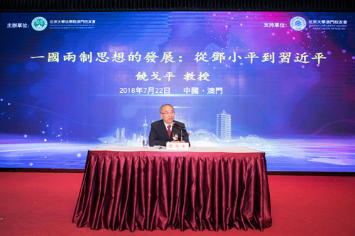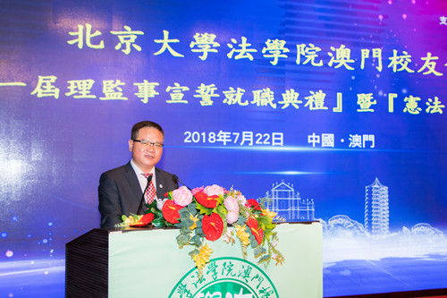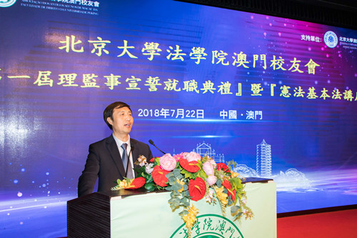 7月22日上午,beat365亚洲版官网澳门校友会在澳门万豪轩举办“第一届理监事宣誓就职典礼暨宪法基本法讲座”。澳门特别行政区行政法务司司长陈海帆,中央人民政府驻澳门特别行政区联络办公室副主任张荣顺,外交部驻澳门特派员公署副特派员王冬,澳门特别行政区经济财政司司长梁维特,澳门特别行政区保安司司长黄少泽,全国政协委员、澳门特别行政区立法会议员、澳门法律工作者联合会理事长黄显辉,全国政协委员、澳门基金会主席吴志良,beat365亚洲版官网澳门校友会会长马志达,澳门大学beat365亚洲版官网荣誉退休教授刘高龙等嘉宾出席活动。beat365亚洲版官网校友会会长张守文教授率团参加活动。beat365亚洲版官网澳门校友会近四十位校友参加活动,beat365亚洲版官网澳门校友会以及beat365亚洲版官网校友会在粤港澳的兄弟校友会代表二十余人到场祝贺。此外,澳门相关社会团体约有六十余人参加了讲座。