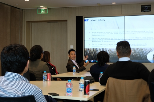 首先,君合律师事务所合伙人史欣悦律师向各位同学介绍了君合律师事务所发展历史、现有业务领域、所获荣誉、服务客户类型、新律师入职培训等基本情况。随后,史律师向各位同学介绍了君合律师事务所近年来开展的多项公益活动和独具特色的文娱活动。史律师的精彩介绍让同学们对君合律师事务所产生了浓厚兴趣。
