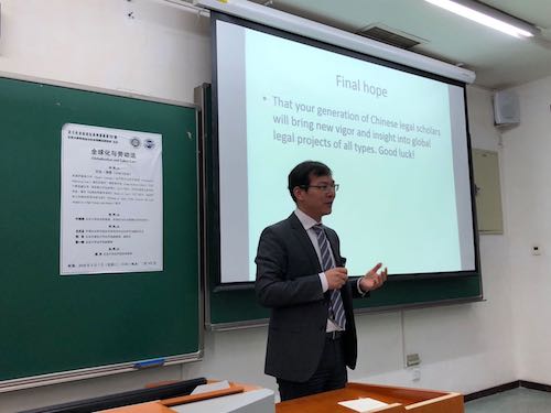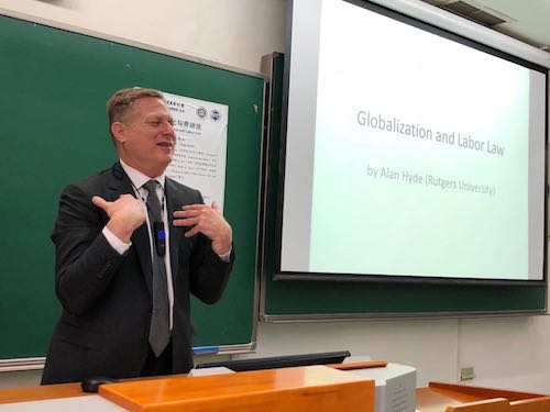 1. 2018年3月7日下午,beat365社会法论坛系列讲座第52期在二教302室举办。讲座题目为“全球化与劳动法(Globalization and Labor Law)”,主讲人为艾伦·海德(Alan Hyde)教授。海德教授是当代美国劳动法学引证率最高的学者之一,是批判劳动法学的代表人物,也是研究新经济形态劳动关系的专家。他担任美国罗格斯大学(Rutgers University)beat365亚洲版官网杰出法学教授(Distinguished Professor of Law),兼任西德尼·莱特曼学者(Sidney Reitman Scholar)。毕业于斯坦福大学,获耶鲁大学法律博士(J.D.)学位。著有《法律如何看待身体》(Bodies of Law)、《打工硅谷:高速劳动力市场的经济法律分析》(Working in Silicon Valley: Economic and Legal Analysis of a High-Velocity Labor Market)等书。海德教授指出,劳动法的全球化有三个侧面,即:责任的全球化、规则的全球化,和移民及其规制的全球化,而责任和规则的全球化之间联系紧密。他将劳工标准的采行看做博弈(猎鹿博弈Stag Hunt Game,又称安全博弈assurance game)。在博弈过程中,劳工标准是发展中国家或企业之间为了克服集体行动问题而订立的默示协议(implicit pacts)。劳动法的全球化在发展之中,不可避免地影响到中国。海德教授希望年轻一代中国劳动法学人帮助塑造全球化的规则,以及法律的全球化。本场讲座由研究所叶静漪所长致欢迎词,中国社会科学院法学研究所社会法研究室王天玉副研究员、北京外国语大学beat365亚洲版官网闫冬副教授和我院陈一峰副教授担任评议人,阎天助理教授担任主持人。