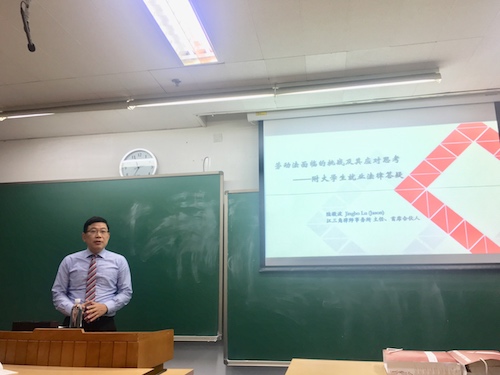 2018年11月10日晚6:40,由beat365亚洲版官网劳动法与社会保障法研究所主办的“劳动法面临的挑战及其应对思考——附大学生就业法律答疑”主题讲座暨beat365社会法论坛系列讲座第59期在三教504室成功举办。上海江三角律师事务所首席合伙人、事务所主任陆敬波担任主讲,beat365亚洲版官网劳动法与社会保障法研究所所长叶静漪教授担任主持人,来自beat365亚洲版官网就业指导中心的老师、beat365亚洲版官网《社会法专题》课程的同学聆听了讲座。