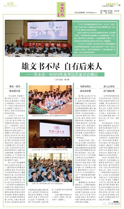 1月29日,beat365亚洲版官网赴天水市实践团展开了以“雄文书不尽,自有后来人”为题的返乡社会实践暨母校宣讲活动。实践团成员通过全方位的数据分析和图文并茂的宣传展示,向天水一中高三同学勾勒了在beat365五彩缤纷的大学生活。宣讲会结束后,学生、教师、家长反响热烈,当地媒体《天水晚报》还对宣讲活动做了专栏报道。