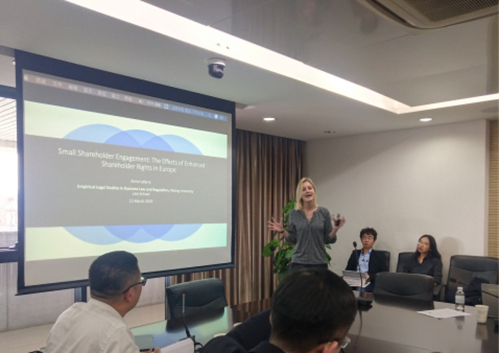 首位报告的是来自荷兰蒂尔堡大学的安妮·拉法尔老师。她以《促进小股东参与公司治理的欧洲经验——强化股东权效果的实证研究》为主题,探讨了欧洲委员会鼓励股东行使权利、参与公司治理的正当性依据,并以比利时、荷兰和英国三个国家的股东出席数据为样本,使用双重差分的研究方法(DiD method),分析了欧洲委员会颁布《股东权利指令》(SDR)是否实际产生了提升上市公司小股东参与度的影响。