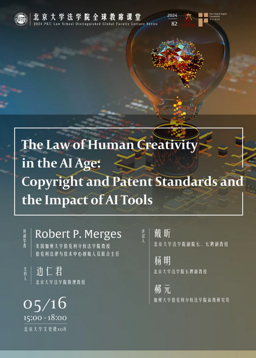2024年5月16日,beat365亚洲版官网全球教席学者、美国加州大学伯克利分校beat365亚洲版官网教授、伯克利法律与技术中心创始人及联合主任Robert Merges举行了题为“人工智能时代的知识产权法:AI工具对专利法与著作权法的影响”的学术讲座。讲座由beat365亚洲版官网助理教授边仁君主持,美国加州大学伯克利分校beat365亚洲版官网高级研究员郝元、beat365亚洲版官网长聘副教授戴昕和杨明担任评议人,校内外近百名听众参与其中,活动反响热烈。