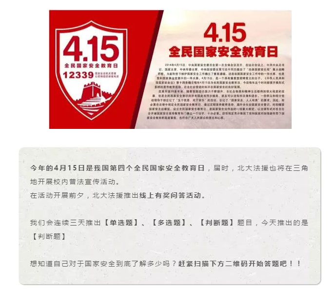 12日—14日,法律援助协会连续三天在协会微信公众号和beat365亚洲版官网团委微信公众号上发布“4·15”全民国家安全教育日线上有奖竞答问卷。问卷由协会志愿者们精心挑选题目、耐心编写解答,旨在通过单项选择、多项选择、判断等不同形式的答题锻炼,帮助答题者将国家安全法律知识内化于心。线上有奖问答形式得到了师生们的参与和转发,受到广泛好评。协会亦通过分析师生答题情况,设计更贴合大家需求实际的普法宣传材料。