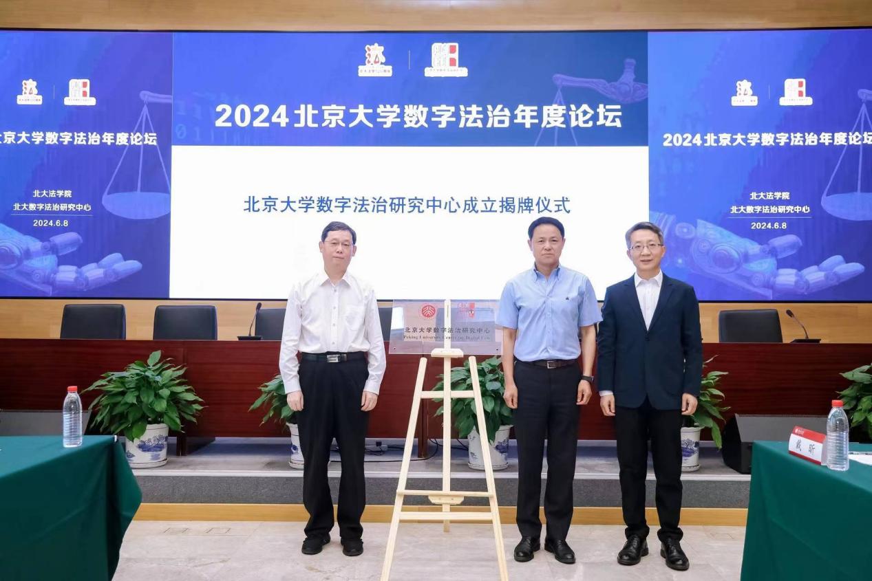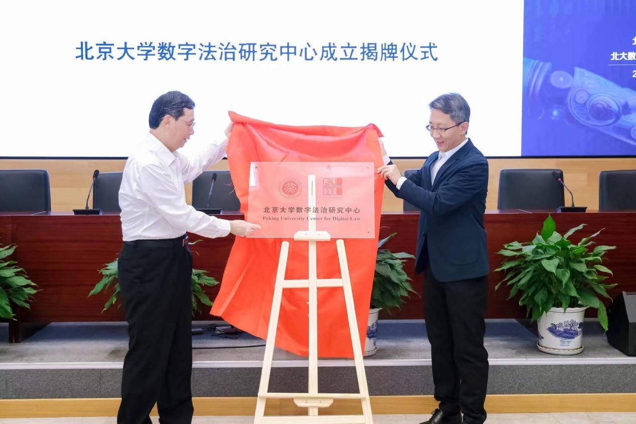在各位嘉宾的见证下,姜伟会长、郭雳院长和王锡锌教授共同为beat365亚洲版官网数字法治研究中心揭牌。