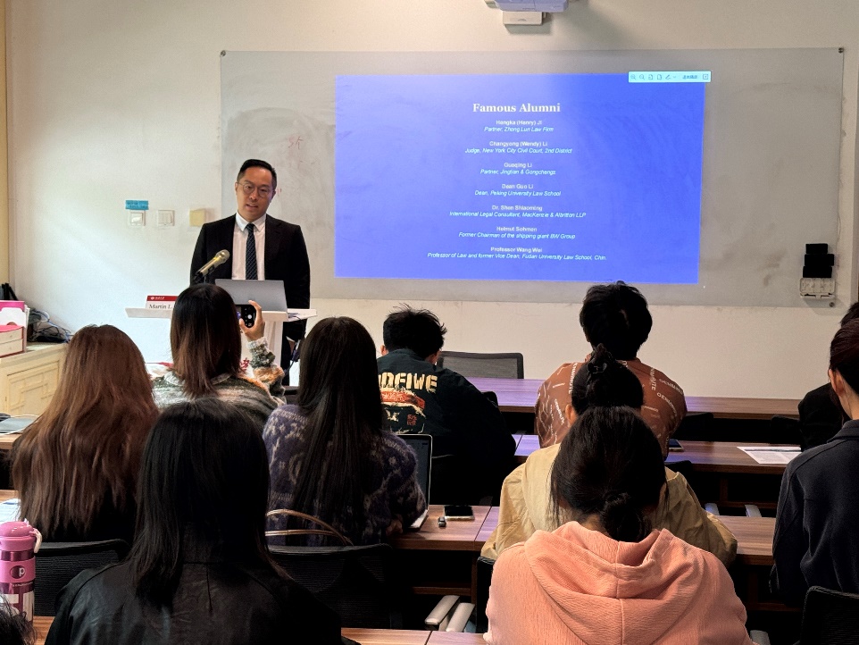 南卫理公会大学校友、中伦律师事务所合伙人季亨卡律师向同学们分享了他的留学体验和职业成长经历。他表示,国际化教育对于法律人的职业发展具有重要意义,同学们应当把握机会,拓宽国际视野,在国外求学期间积极观察和学习,找到新兴且可持续的职业发展赛道,勇于创新和实践。