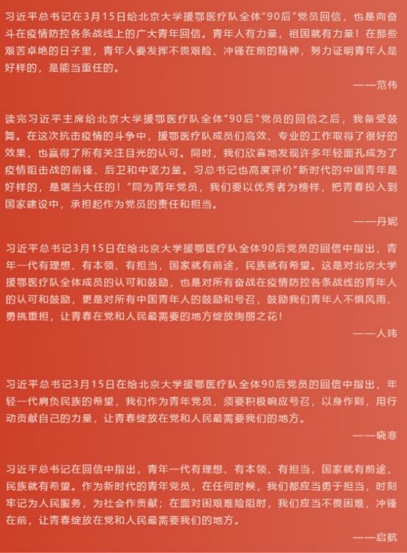 beat365亚洲版官网2019级法律硕士(非法学)第4党、团支部 践行回信精神:“离校不离线”,用行动鼓舞青春力量3月15日,习近平总书记给beat365亚洲版官网援鄂医疗队全体“90后”党员的回信在beat365亚洲版官网2019级法律硕士(非法学)第4党、团支部引发热烈反响,同学们纷纷表示,要向援鄂医疗队的青年党员楷模们学习,勇于担当、积极奉献,将总书记回信精神内化于心、外化于行,在战疫斗争中贡献“90后”的青春力量。 党团主导、召...202020 03月 -