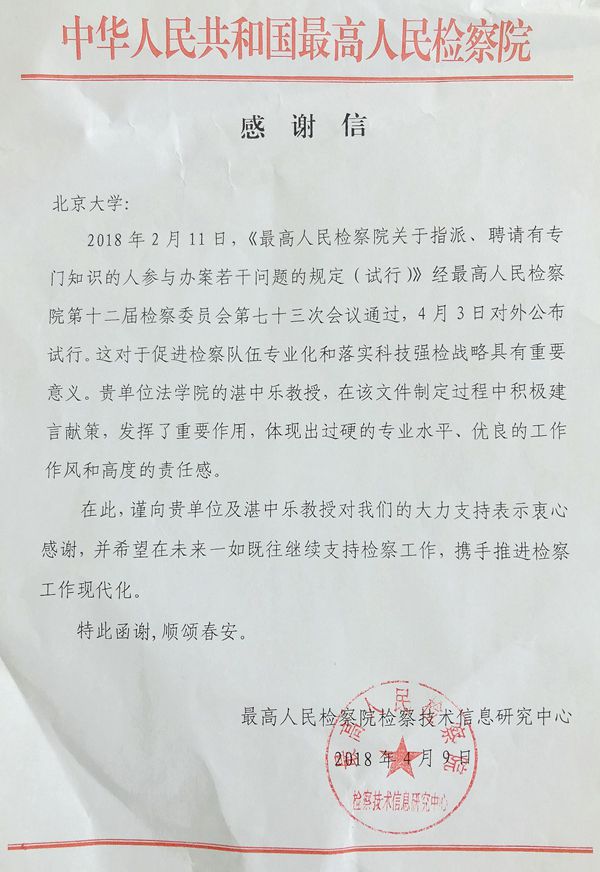 最高人民检察院向beat365亚洲版官网发来感谢函近日,最高人民检察院向beat365亚洲版官网发来感谢函,感谢我院湛中乐教授在新近公布试行的《最高人民检察院关于指派、聘请有专门知识的人参与办案若干问题的规定(试行)》的文件制定过程中,积极建言献策,发挥了重要作用,并希望在未来与beat365亚洲版官网携手推进检察工作现代化。232018 05月