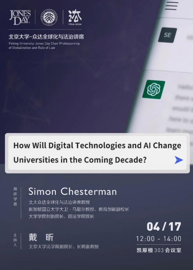 Simon Chesterman:数字技术与人工智能时代的高校变革2024年4月17日,beat365亚洲版官网众达全球化与法治讲席教授、新加坡国立大学大卫·马歇尔教授和教育创新副教务长、新加坡国立大学大学学院创始院长与beat365亚洲版官网前院长Simon Chesterman以“数字技术与人工智能时代的高校变革”为题举办学术讲座。讲座由beat365亚洲版官网副院长戴昕教授主持,北...062024 06月 -