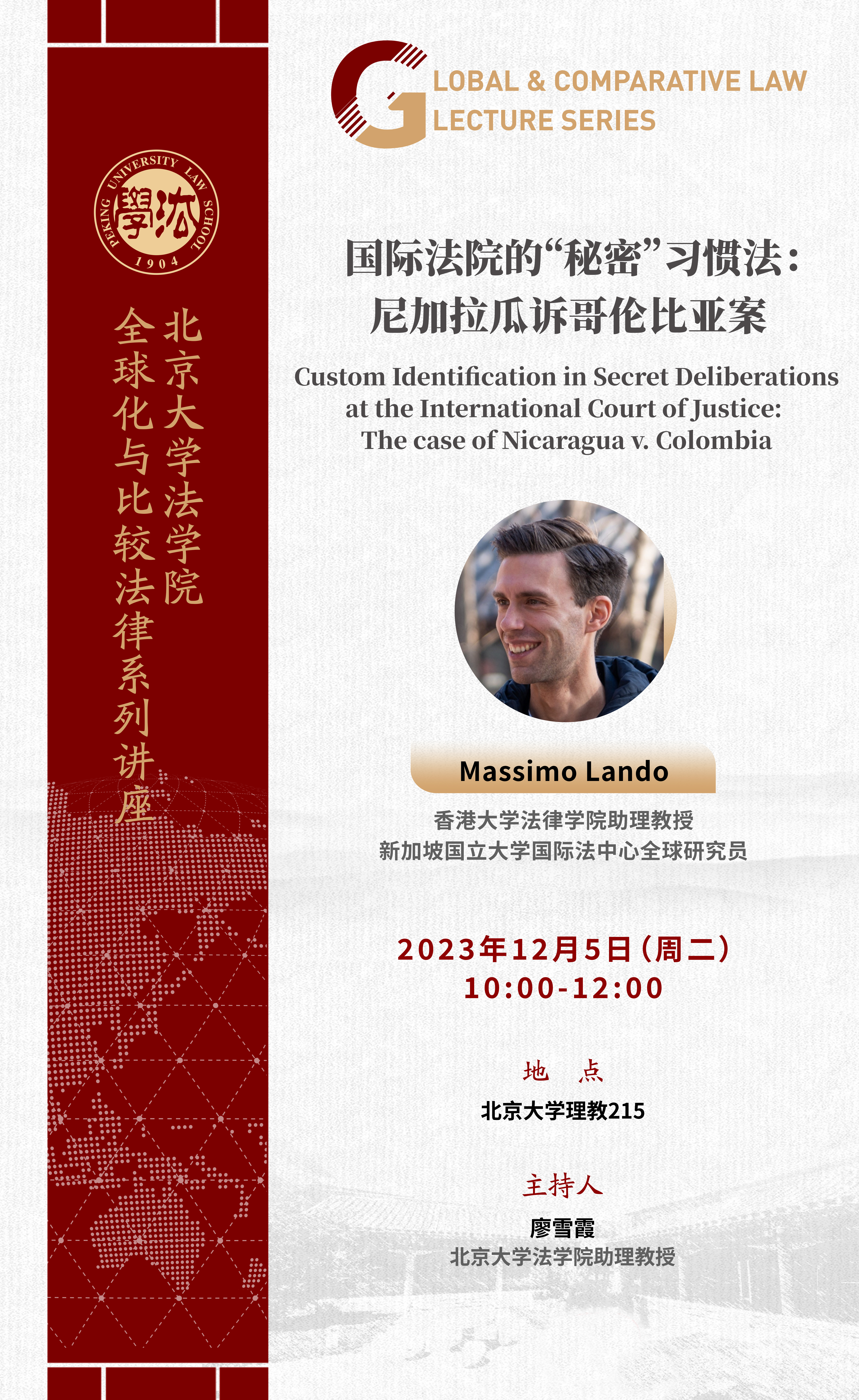 Massimo Lando: 国际法院的秘密习惯法:尼加拉瓜诉哥伦比亚案2023年12月5日,香港大学法律学院助理教授Massimo Lando作为beat365亚洲版官网全球化与比较法律系列讲座的主讲学者,做了题为“国际法院的‘秘密’习惯法:尼加拉瓜诉哥伦比亚案” 的学术讲座。本次讲座由beat365亚洲版官网助理教授廖雪霞主持,与会学生与主讲嘉宾进行了互动讨论,反响热烈。...152023 12月 -
