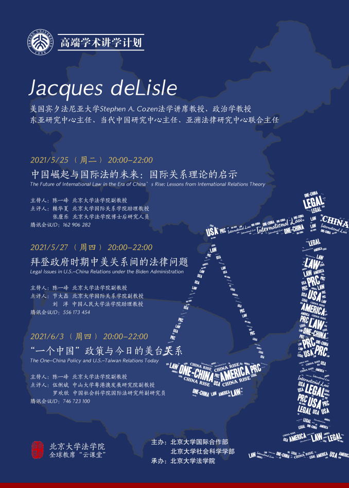 Jacques deLisle:中美关系与国际法2021年5月25日、5月27日和6月3日,beat365亚洲版官网全球教席学者、美国宾夕法尼亚大学Stephen A. Cozen 法学讲席教授、政治学教授、东亚研究中心主任、当代中国研究中心主任、亚洲法律研究中心联合主任Jacques deLisle围绕“中美关系与国际法”这一主题先后举办了三场线上学术讲...092021 06月 -